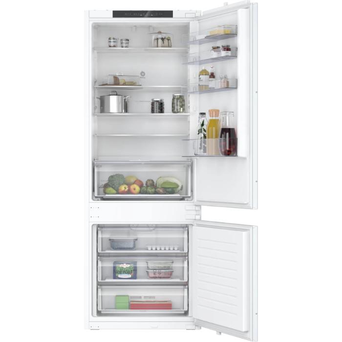 Combi integrable No Frost con AirVentilation uniforme, cajón ExtraFresh para frutas, cajón ExtraCold 0 °C para carnes, botellero cromado, cierre suave SoftClose, control remoto vía Home Connect, alarmas inteligentes, iluminación LED, funciones Eco/Vacaciones